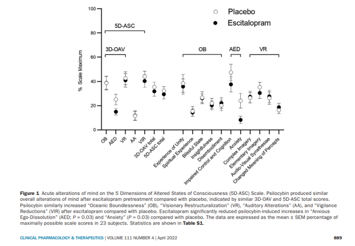 Contudo, o Investigador Principal do estudo com escitalopram, Dr. Matthias Liechti, não observou um impacto nos efeitos da psilocibina no grupo que tomou o SSRI, embora se deva ter em conta que foi um estudo pequeno. Ele disse que “estes resultados indicam que a psilocibina pode ser doseada durante o tratamento com escitalopram sem um impacto aparente no efeito da psilocibina”.