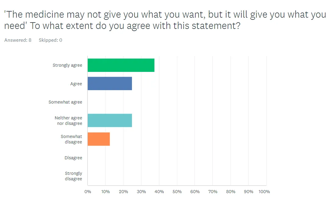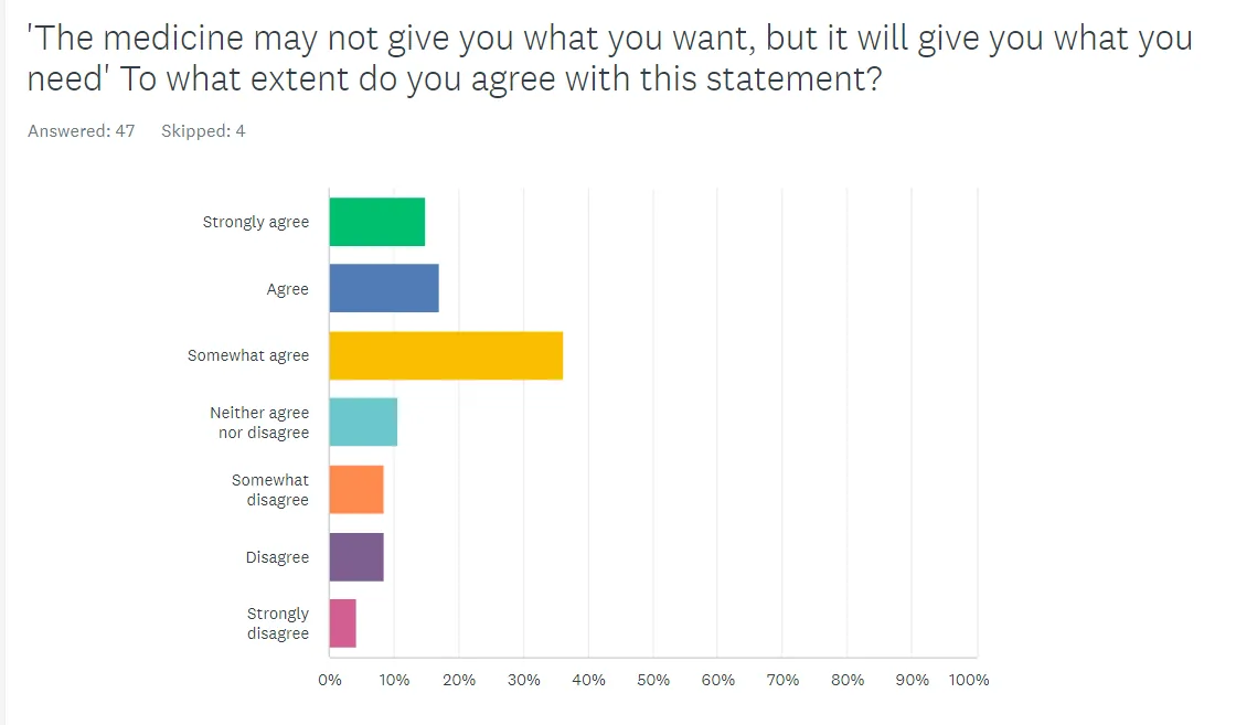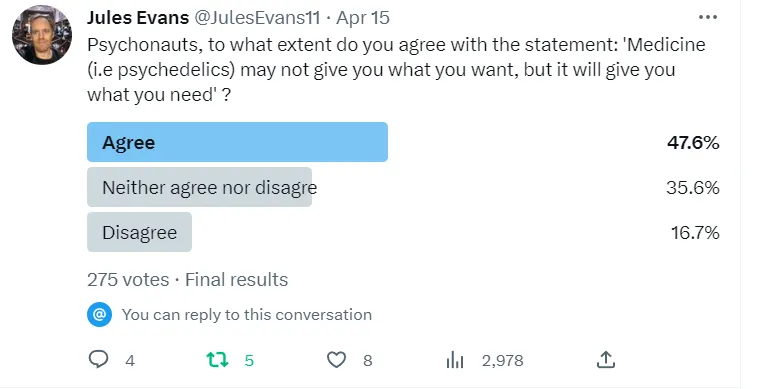 A concordância com a afirmação também parece ser mais forte entre os facilitadores de psicadélicos do que entre os usuários. Fiz duas investigações – uma para psiconautas e outra para curandeiros/facilitadores/terapeutas psicadélicos, a questionar até que ponto eles concordavam que “a medicina pode não dar o que se quer, mas vai dará aquilo que precisa”. Entre os psiconautas, 70% concordaram – mas a maioria concordou apenas um pouco.