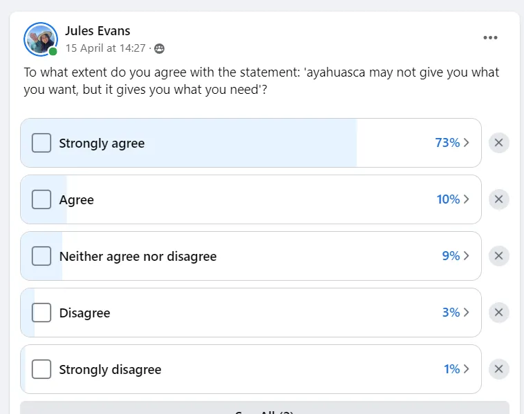 Na principal página de Ayahuasca do Facebook, houve uma forte concordância entre os usuários de Ayahuasca de que a Ayahuasca oferece sempre aquilo que as pessoas precisam: