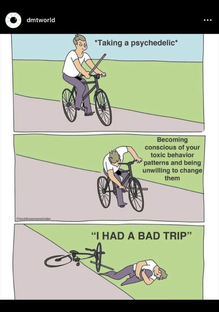 Mas as crenças de que experiências desafiantes são sempre recompensadoras e que a substância psicadélica nunca é prejudicial são componentes de fé, o que William James chamou de crenças excessivas, como “tudo acontece por uma razão” ou “Deus está sempre a cuidar de si”. Elas são crenças teológicas ao invés de ciência de valor neutro. Crenças excessivas podem ser muito consoladoras para uma pessoa e ajudá-la a entender o seu sofrimento. Mas é diferente se você receber esse dogma de um curador ou terapeuta quando estiver a ter uma reação assustadora com uma substância. É como ser instruído a 'confiar na sua sabedoria interior de cura' quando a pessoa se sente que se está a desmoronar. Isso pode levar à culpabilização da vítima, como no meme abaixo, em que os efeitos adversos são culpa sua por não seguir a “sabedoria da medicina”.