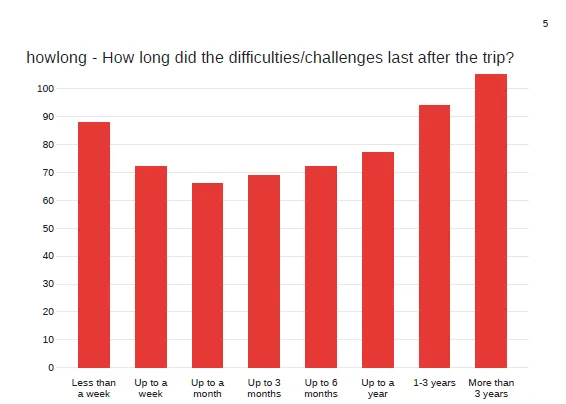 - 39% das pessoas que tiveram uma experiência desafiante disseram que foi uma das cinco experiências mais difíceis de suas vidas. Daqueles cuja experiência ocorreu há mais de um ano, 7,6% procuraram tratamento por sintomas psicológicos persistentes. 16% dos entrevistados sentiram que não se beneficiaram com a experiência. (Carbonaro e outros, 2016)