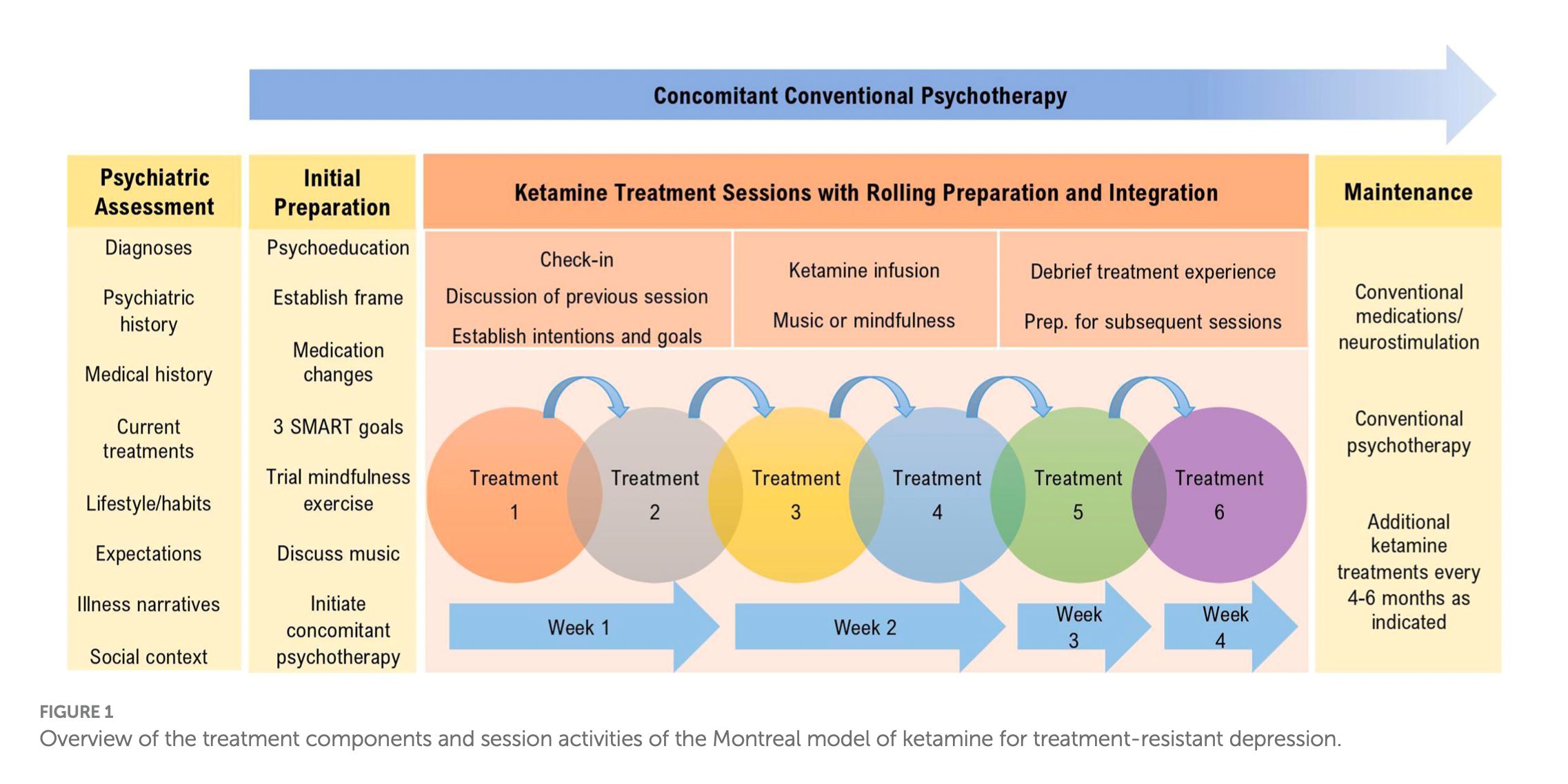 O modelo integrativo de Montreal pretende enquadrar-se entre estes dois últimos, assentando no conceito de que a cetamina não deve ser vista como uma substância autossuficiente no tratamento destas perturbações, mas sim como um catalisador de uma abordagem multifacetada. Uma das motivações mais importantes deste modelo é a diminuição da necessidade de prolongar a duração dos tratamentos com cetamina, dado que a mesma poderá ter efeitos danosos a longo prazo, tem custos importantes associados e várias limitações logísticas e de recursos humanos associadas.